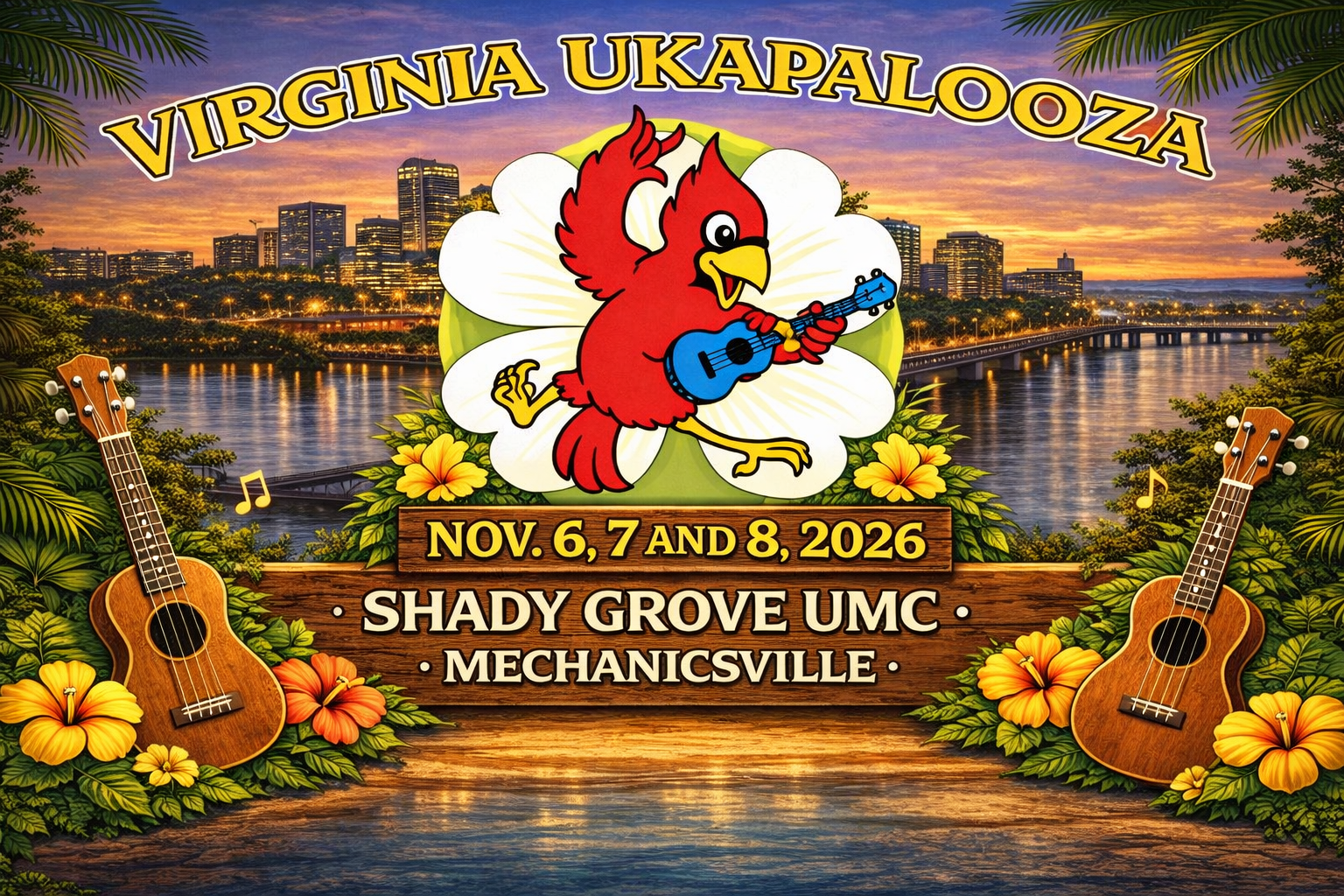 Virginia Ukapalooza 2026 will be a packed, three-day event of ukulele related learning, playing, and socializing – conducted by the VA ukulele community, for the VA ukulele community. Playing opportunities will be provided for all registered ukulele groups and all attendees (in a ukulele group or not). Numerous workshops will be offered for all abilities. Nationally known and regional ukulele talent will perform and teach. The ticket price includes access to all festival events, 11/6 through 11/8. Early bird tickets will be available for purchase by 6/1. Check back soon for all the details, including the roster of presenters, performances, and vendors!